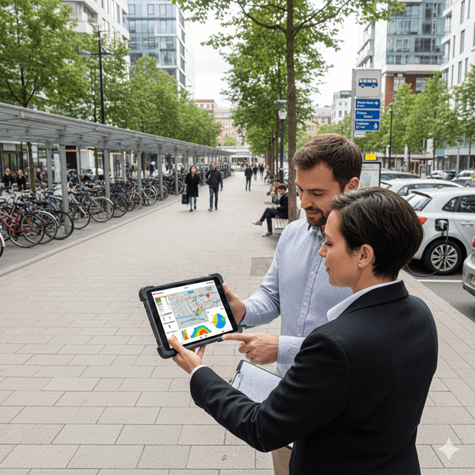 Vor Projektstart erarbeiten wir detaillierte Konzepte für Parkraum, Car-/Bike-Sharing, Fahrradparken, Ladeinfrastruktur und PV. Dazu gehören Standortbegehungen, Analyse der bestehenden Strukturen und die Entwicklung konkreter Maßnahmenpakete.